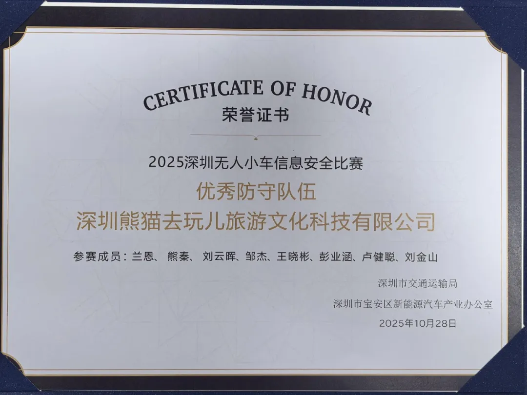 熊猫去玩儿面对高强度、多维度的网络攻击挑战,其无人驾驶代步车系统凭借出色的安全防护与应急响应能力,荣获“优秀防守队伍”称号。